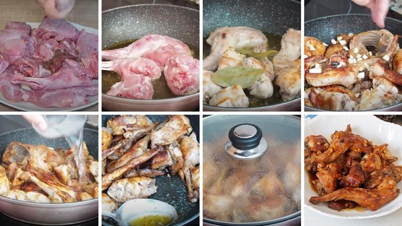 Comenzamos salpimentando el conejo que ya lo tenemos limpio y troceado (puedes pedirle a tu carnicero que te lo prepare).Ahora, ponemos en una sartén un buen chorreón de aceite de oliva virgen extra, lo ponemos al fuego y cuando esté bien caliente vamos a ir añadiendo los trozos de carne.