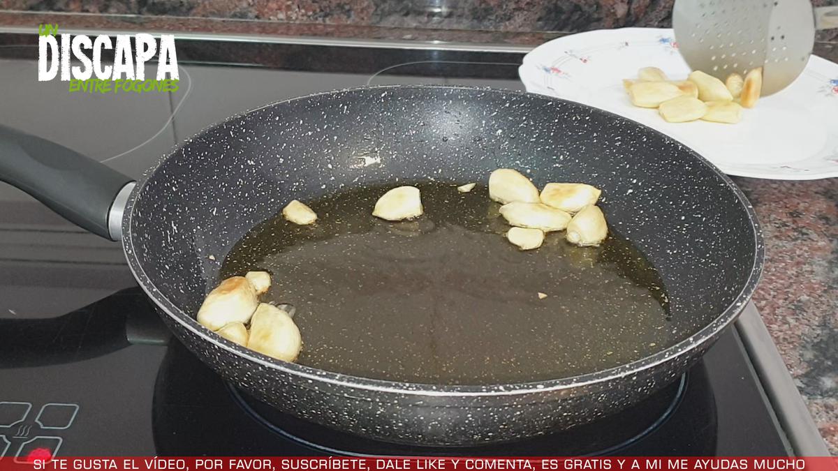 3Cuando los ajos ya han cogido un ligero color dorado, los retiramos de la sartén y los reservamos.