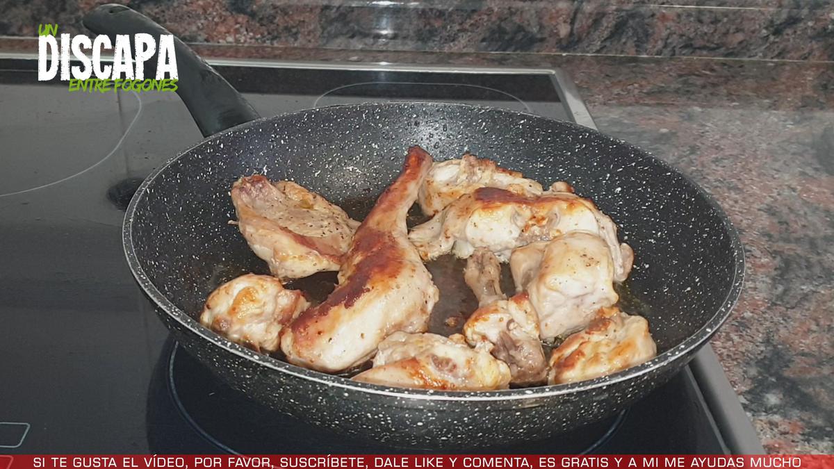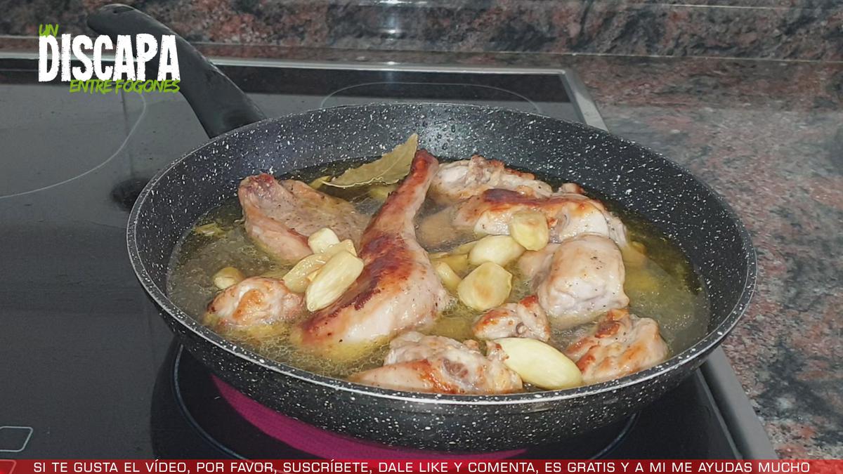 4Y ahora en la misma sartén donde hemos dorado los ajos, vamos a dorar el conejo a fuego medio. Le ponemos una tapa para que no salpique demasiado.