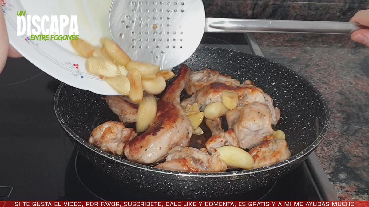 5Cuando ya tenemos el conejo bien dorado, incorporamos los ajos junto con el conejo.