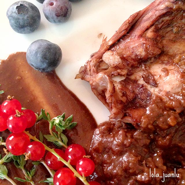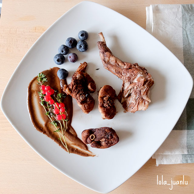 Servimos el conejo con la salsa por encima y decoramos con grosellas y arándanos.