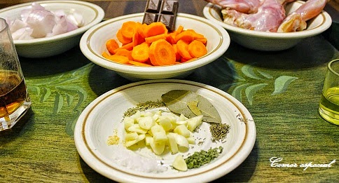 INGREDIENTES (para 2/3 personas): medio conejo troceado, aceite de oliva, zanahoria, cebolla, ajo, orégano, tomillo, romero, ajo molido (si pueden, sustituir el ajo por pimienta, nosotros no podemos), laurel, sal, 1/2 vaso pequeño de brandy o coñac, 4-6 onzas (cuadrados) de chocolate negro lo más puro posible y 250-300 mililitros de agua.