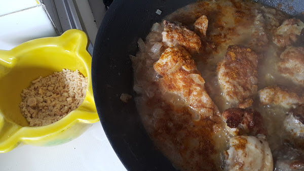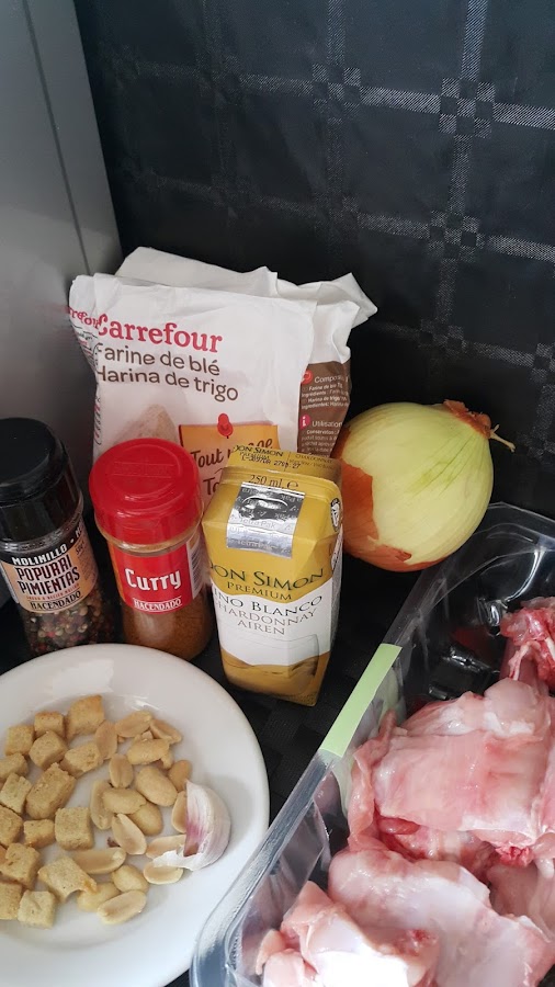 Transcurrido ese tiempo añadimos 2 cucharadas de postre de curry, los cacahuetes y el pan. Lo dejamos a fuego muy bajo otros 15 minutos.