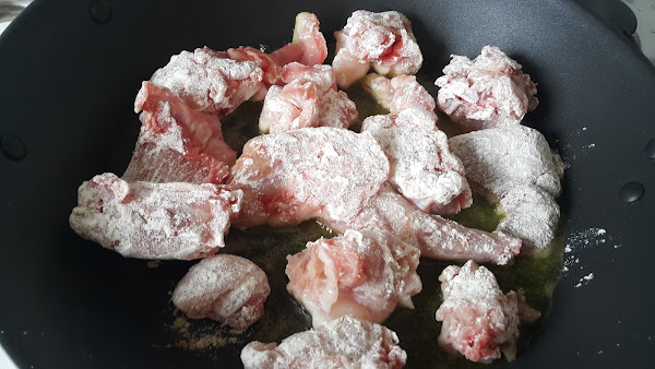 Salpimentamos el conejo y lo enharinamos. Seguidamente lo freímos a fuego fuerte para sellarlo.