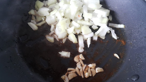 En la misma sartén cocinamos el ajo y acto seguido la cebolla y la dejamos pochar a fuego suave.