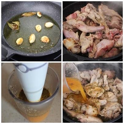 Se le añade al conejo el majado que hemos triturado anteriormente, se cubre con agua y se deja cocer hasta que el conejo esté tierno y la salsa haya reducido por lo menos, hasta la mitad.