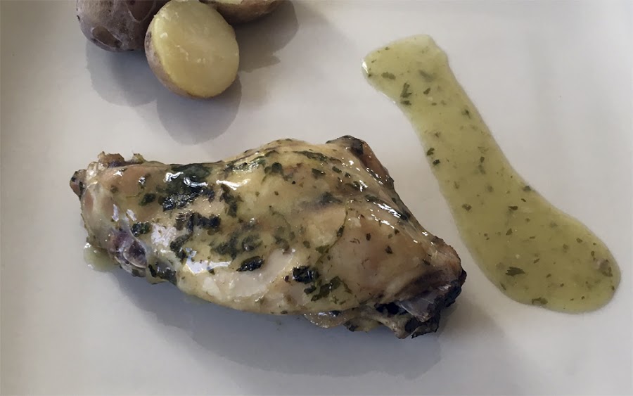 Al resto del mojo le añadimos un chorrito de vino blanco, mezclamos y, con esta mezcla, regamos un poco la carne de conejo