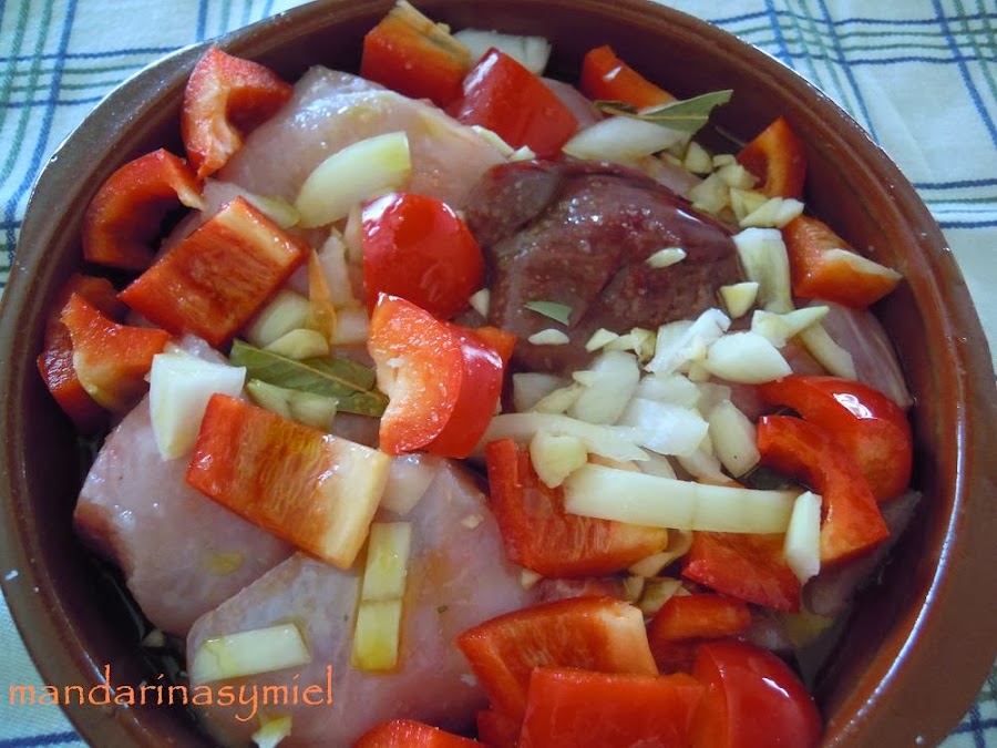 Ahora echa por encima las especias: tomillo, romero, azafrán... y pon los granos de pimienta.