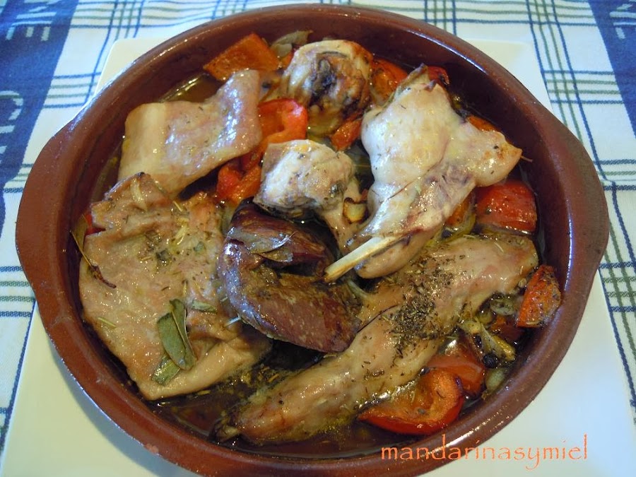 Sazona el conejo troceado y ponlo en la cazuela con la hoja de laurel.