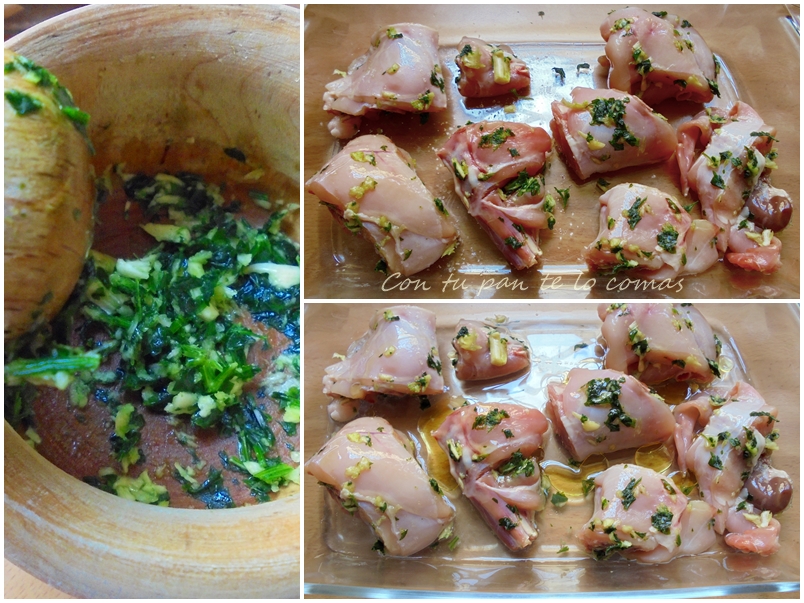 2. Sazonamos los trozos de conejo y los embadurnamos con el majado.