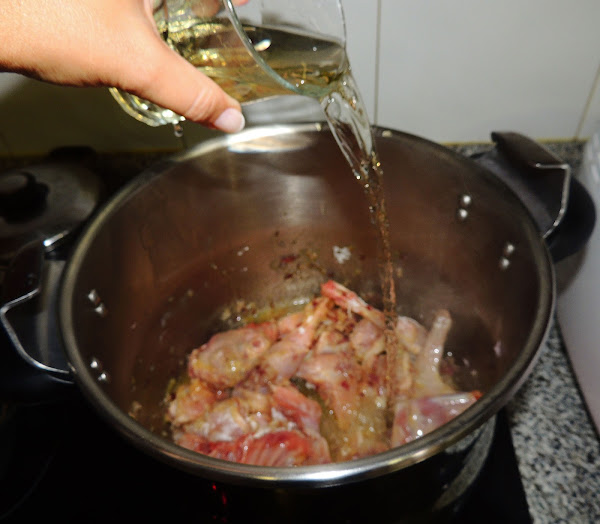Se espolvorea con harina, se remueve con una cuchara de madera y se agrega el Jerez y el agua.