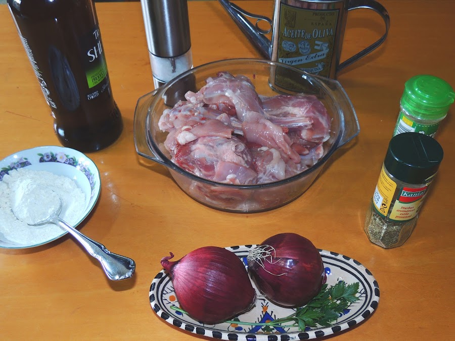 Un conejo de un kilo aproximadamente, una cebolla grande o dos pequeñas, una cucharada y media de harina, un vaso grande de Jerez, un vaso grande de agua, 8 cucharadas de aceite de oliva, una ramita de perejil, sal y una cucharadita de hierbas aromáticas.