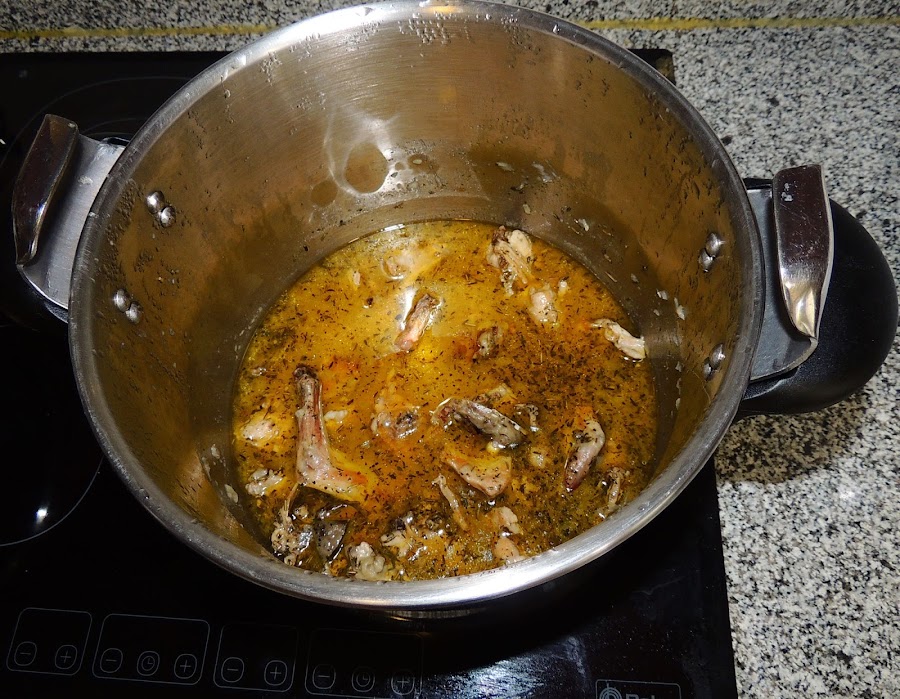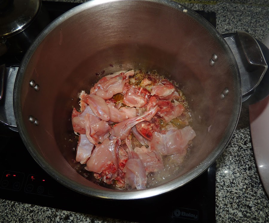 Se calienta el aceite en la olla exprés durante unos 2 minutos y se sofríe la cebolla. A continuación, se añade el conejo.