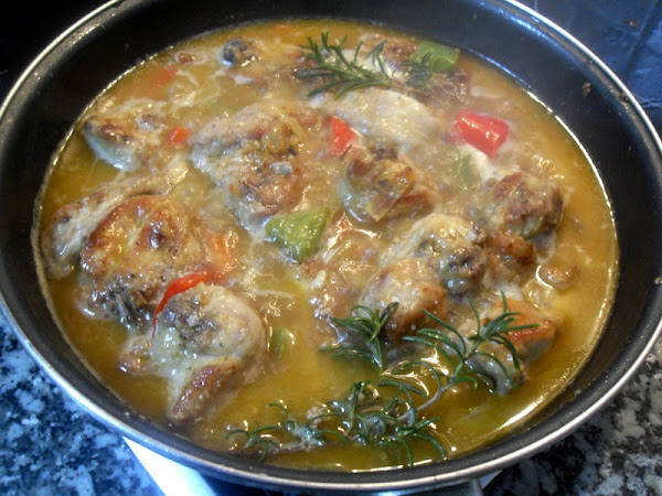Poner en una cazuela plana aceite a calentar, cuando esté el aceite caliente, dorar las piezas por todos los lados. Sacar y reservar.