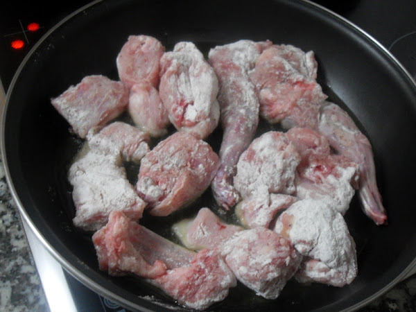 Incorporar el conejo, el vino y dejarlo evaporar.