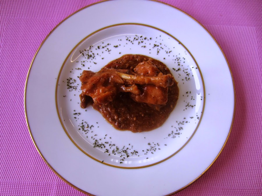 Agregamos una taza de caldo y añadimos todo el majado al conejo.