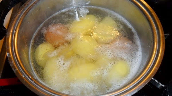 Mientras se pocha, cocemos las patatas y huevos muy limpios... en una cazuela con un poco de sal.