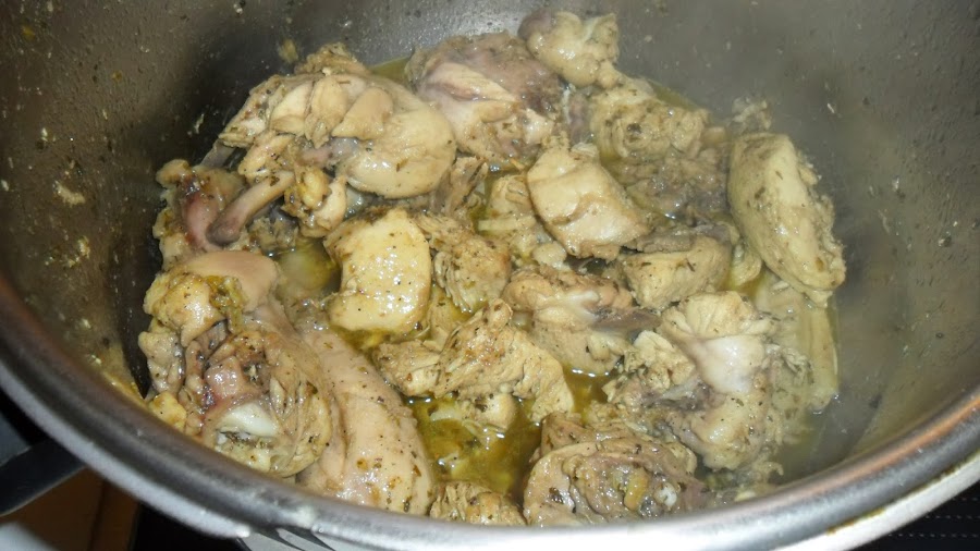 Añadimos a la cazuela el conejo y dejamos que se rehogue muy bien por todas partes.