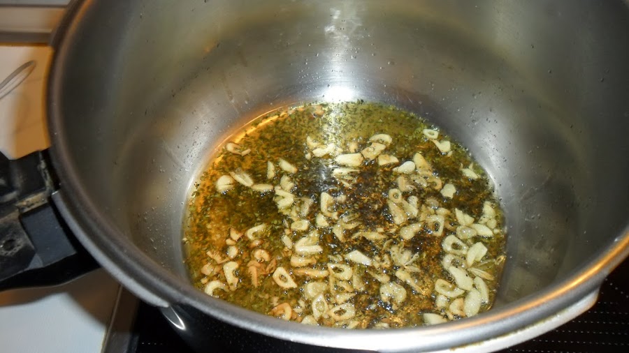 En una cazuela con aceite de oliva, salteamos los 6 dientes de ajos picados y las especias.