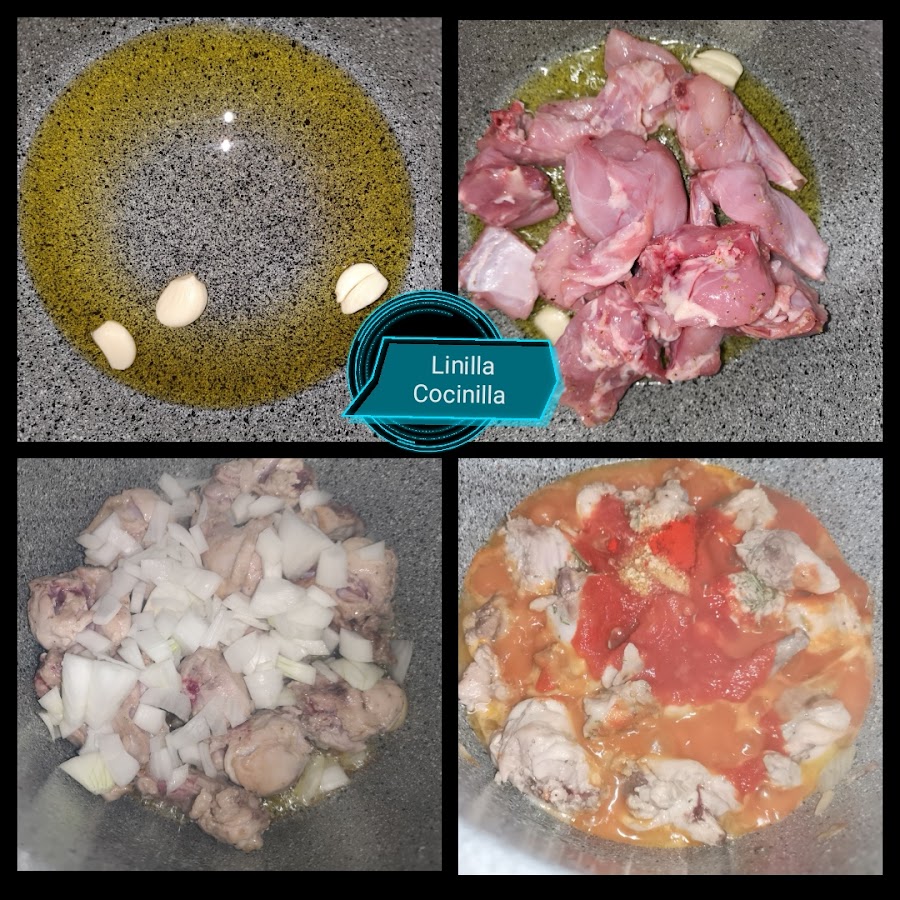2. Ponemos el aceite en la cubeta junto con los ajos y programamos menú sofreír/140ºC/15 minutos. Cuando el aceite se caliente agregamos el conejo salpimentado previamente.