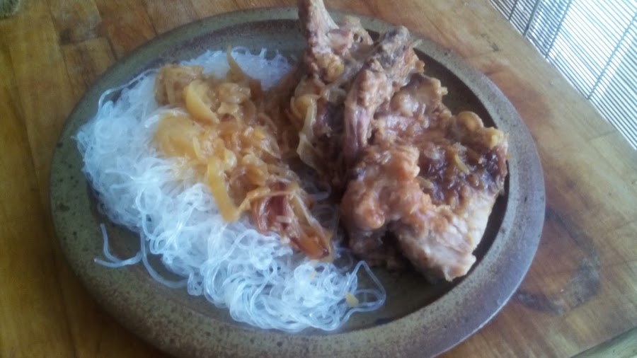 HOy cocinamos conejo con cebolla pero lo hemos hecho de una manera un poco especial ya que lo he hecho para poder comerlo en mi dieta y he usado mi fussioncook. El resultado ha sido muy pero que muy bueno y lo he acompañado con unos fideos chinos. En primer lugar cortaremos 4 cebollas medianas en juliana y la pondremos en la cubeta de la fussion añadimos el conejo, medio vaso de vino blanco y un sobre de sopa de cebolla, tapamos la olla y programamos menú carne 20 min válvula cerrada.Una vez finalizado despresurizar y mirad que pinta mas buena. Como habeis visto no le he puesto sal pues con el sobre de sopa es suficiente. Podemos servir con fideos, arroz o patatas.