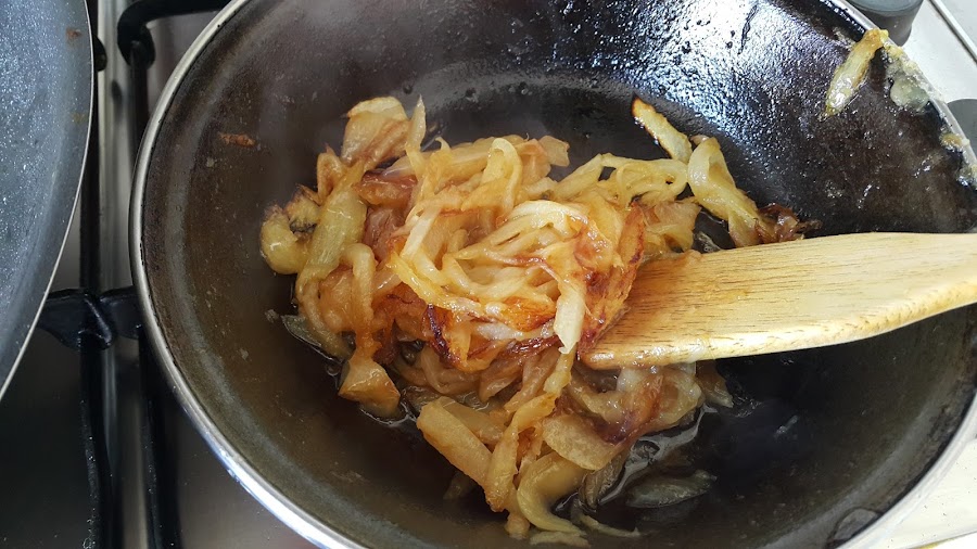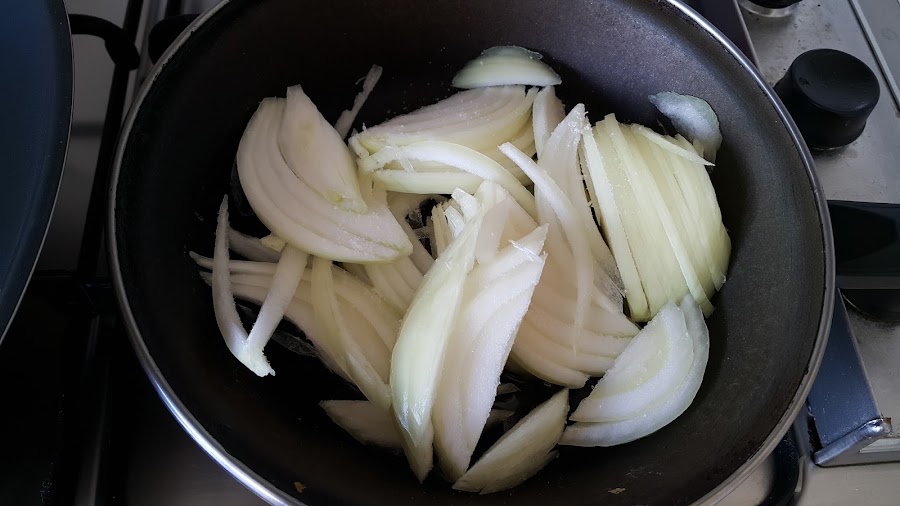 Lo primero que haremos es cortar la cebolla en juliana y ponerla con un poco de aceite en una sartén a fuego muy bajo y tapada para caramelizarla.