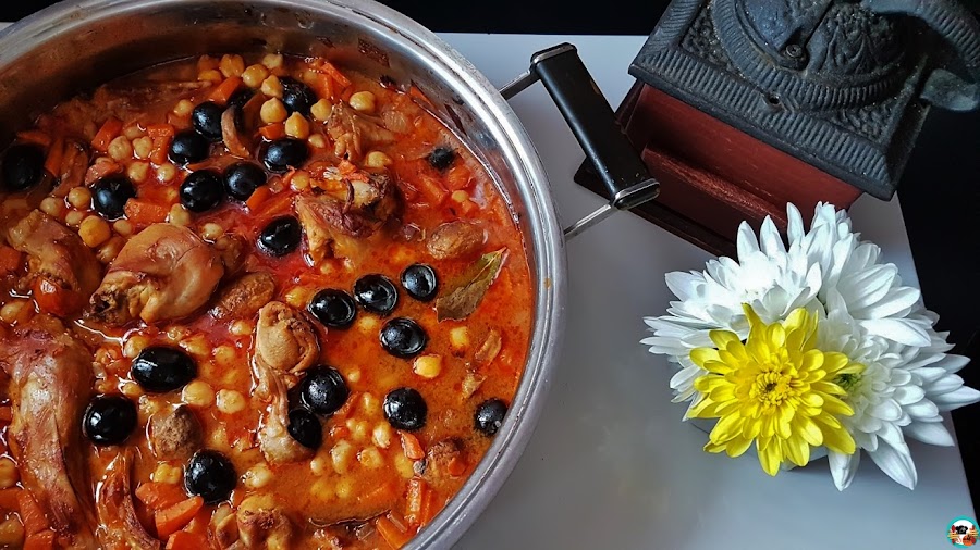 Hoy toca preparar un sabroso guiso de carne de conejo con garbanzos y olivas negras.