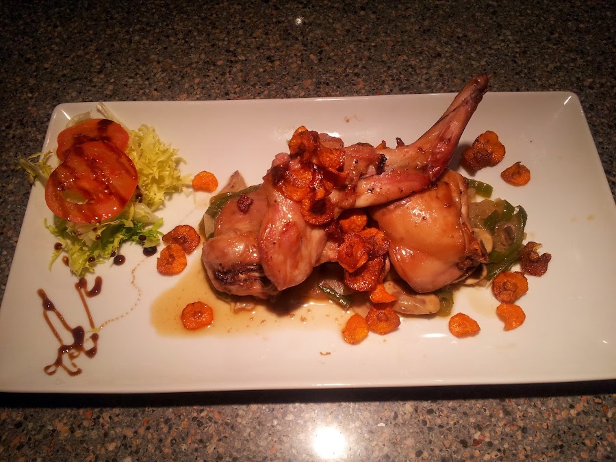 Momento de emplatar: colocamos una base con nuestra fritada de cebolla, pimiento y champiñones. Sobre ella disponemos las piezas de conejo y coronamos con el toque crujiente de las chips de zanahoria. Podemos acompañar de un toque verde con escarola y tomate ligeramente aderezado con vinagreta de aceite, vinagre de Módena y un poco de sal.