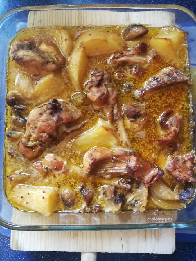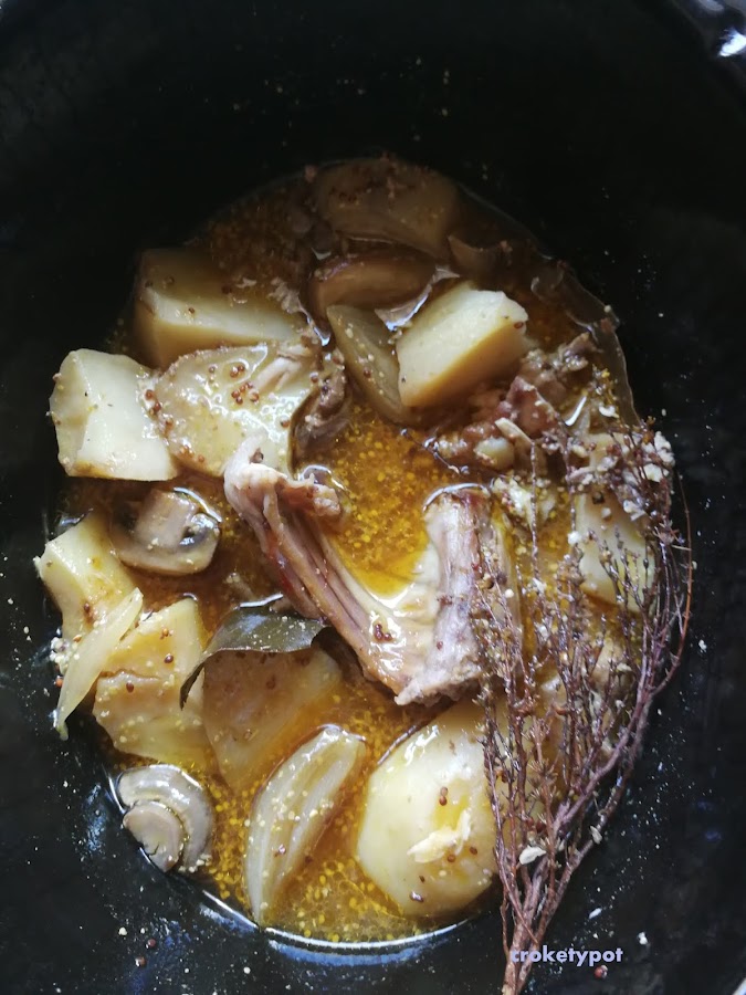 INGREDIENTES: (2-3 personas) Medio conejo troceado y medio hígado, 6 o 7 champiñones, 3 chalotas, 1/2 vaso de vino blanco de Montilla , 1 cucharada de mostaza antigua, 3 dientes de ajo, una rama de tomillo, 2 hojas de laurel, 1 cucharada de mantequilla, 1 cucharada de mostaza antigua, la punta del cuchillo de pimentón, comino y cúrcuma; aceite AOVE, sal y pimienta. 2 patatas pequeñas.