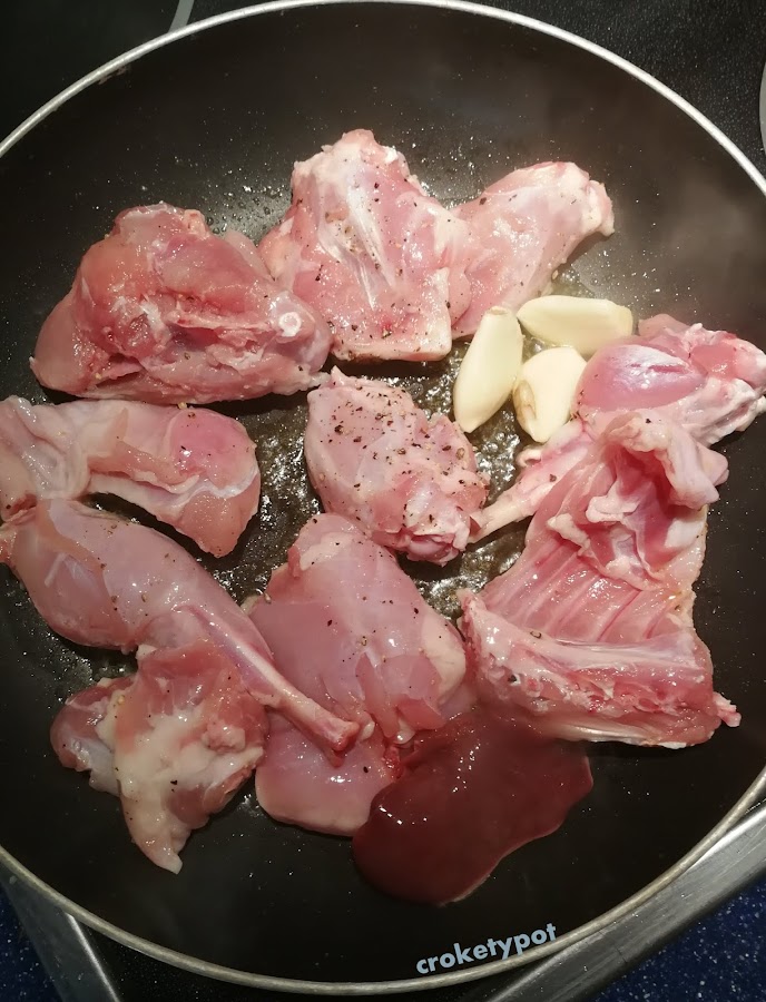 En una sartén a fuego fuerte, ponemos la mantequilla y el aceite, añadimos los trozos de conejo con los ajos y el hígado y damos vuelta y vuelta hasta que tome color.