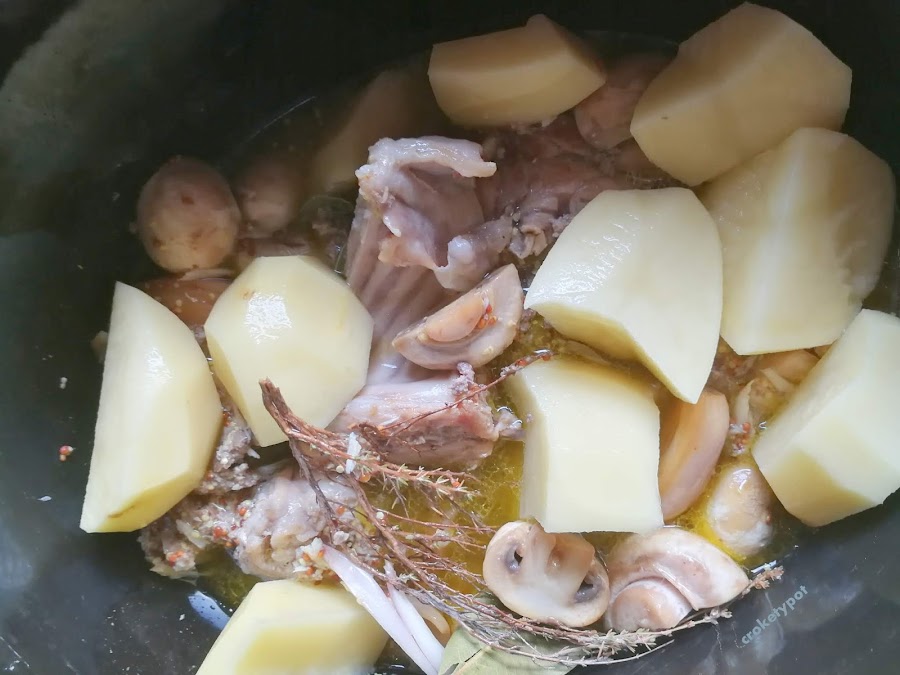 Partimos en dos los champiñones y las chalotas y lo añadimos a la sartén, salteamos y se le añade el vino blanco, se deja evaporar y lo pasamos todo a la olla lenta, con el tomillo y el laurel.