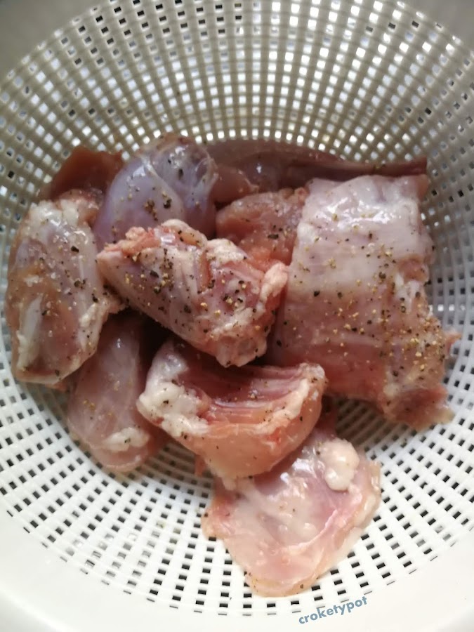 En el mortero machacamos los ajos junto con el hígado y las especias, hacemos una pasta, añadimos una cucharada de mostaza antigua, lo mezclamos le añadimos agua y se mueve todo bien. Lo añadimos a la olla lenta.