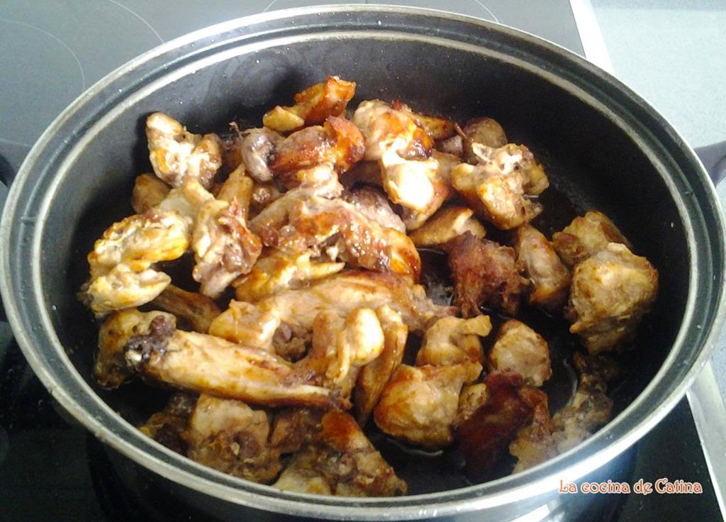 Cortamos el conejo en trozos. Ponemos en una sartén un vasito de aceite de oliva a calentar. Echamos sal al conejo y lo vamos friendo en tandas, sacamos y reservamos.