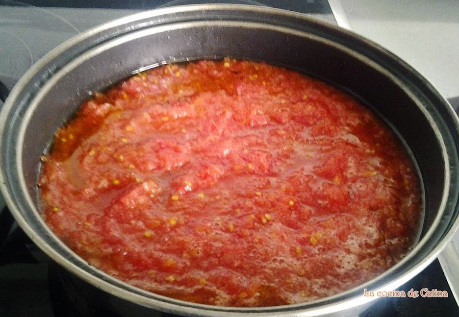 Rallamos los tomates y le ponemos sal, freímos en el mismo aceite a fuego lento durante 20 minutos, añadimos una cucharadita de azúcar, removemos bien y dejamos cinco minutos más.