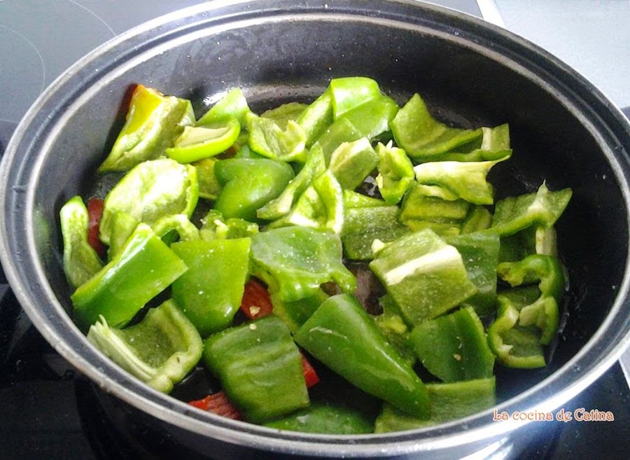 En el mismo aceite freímos los pimientos troceados, cuando estén fritos sacamos y reservamos.