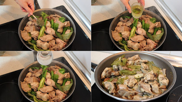 Añadimos el vino blanco y el agua y lo dejamos cocer a fuego medico hasta que reduzca y el conejo esté tierno, si es necesario poner un poco más de agua, lo hacemos...