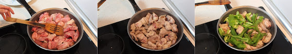 En una sartén ponemos un poco de aceite y sofreímos el conejo troceado y con un poco de sal y pimienta molida. Cuando esté dorado añadimos los pimientos troceados a tiras gruesas.