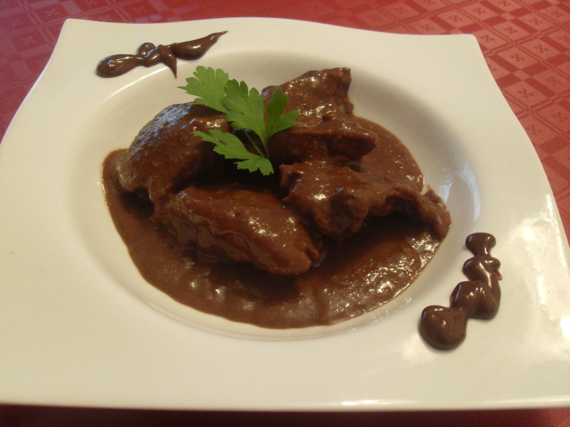 Dorar en una cazuela con aceite: el ajo, el pan tostado, los frutos secos, el hígado, triturar todo en en bote para la batidora con el vino blanco, un poco de caldo y 75 gr. de chocolate.