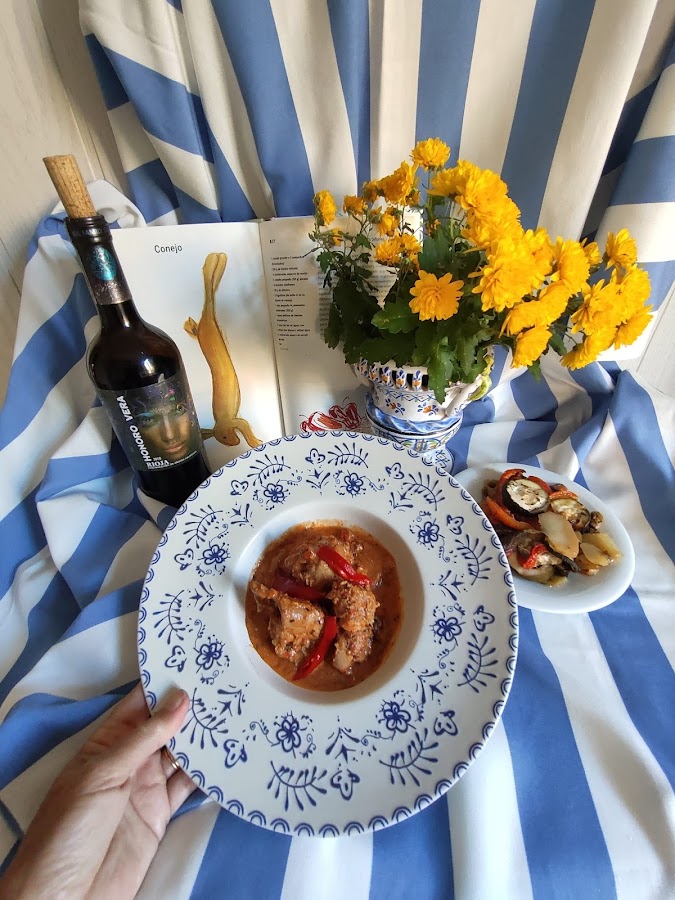 En una cacerola ponemos el aceite a calentar; cuando está caliente, se refríe el tocino cortado en dados y la cebolla. Cuando se les ha dado unas vueltas, se añaden los trozos de conejo y, moviéndolos con una cuchara de madera, les dejamos dorar ligeramente.