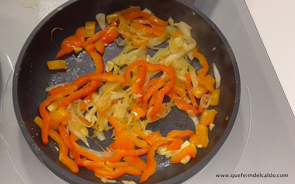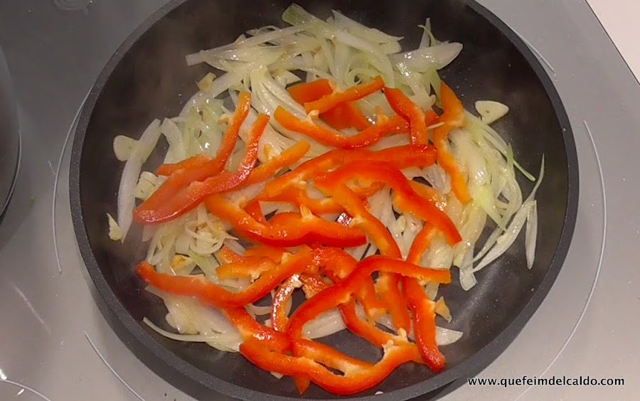 Transcurrido los 10 minutos añadimos el medio pimiento rojo también cortado en juliana. Dejamos caramelizando alrededor de 30 minutos a potencia de fuego muy bajo 4-9