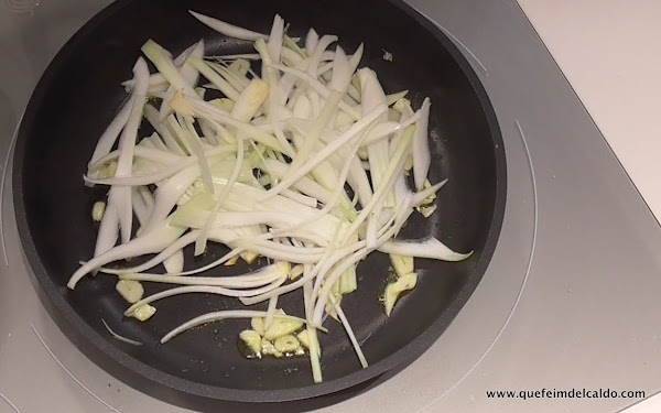 Una vez dorados los ajos ponemos la cebolla tierna cortada en juliana, dejamos 5 minutos pochándose.