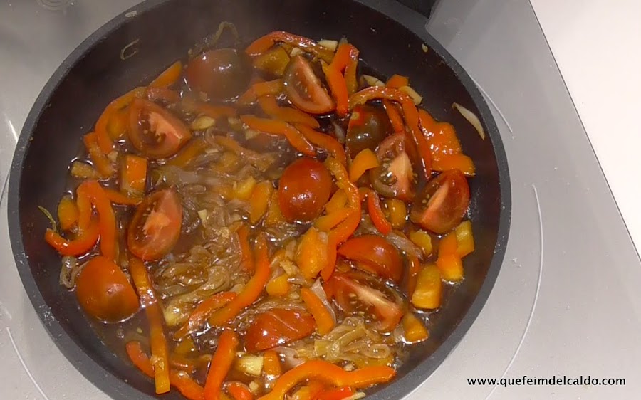 Una vez el pochado está perfecto y las verduras caramelizadas, cortamos los tomates cherry en cuartos y los introducimos en la sartén.