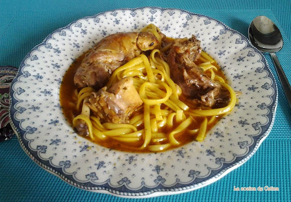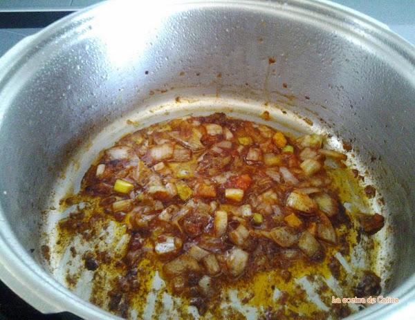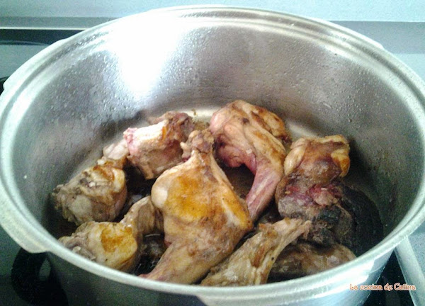 Preparación:Se sofríe el conejo en una cazuela a la que hemos puesto un chorrito de aceite, cuando está se retira y se reserva.