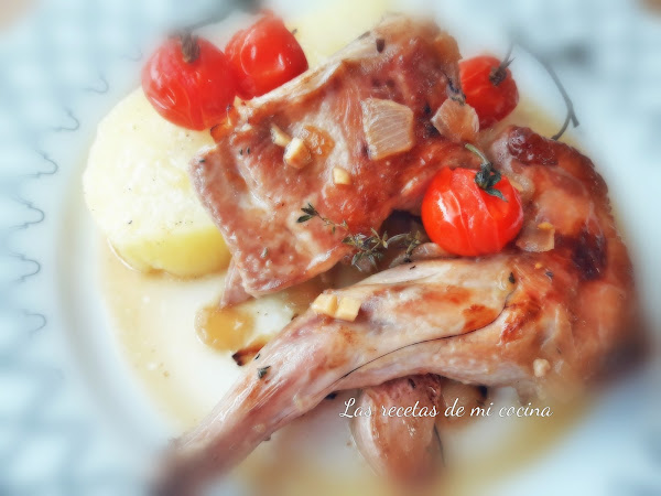 Conejo con tomillo, patatas y tomates cherrys al horno