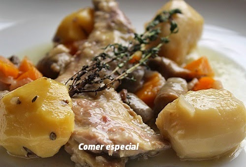 INGREDIENTES (para 2-3 personas): 250 gramos de patatas (papas) pequeñas, medio conejo pequeño, 2 zanahorias cortadas en trozos, 150 gramos de champiñones en trozos, tomillo, 8 ajos enteros con piel, un vaso grande de vino blanco, 1 vaso y medio grande agua, sal, ajo molido, 1 cebolla pelada en gajos, 1 cuchara pequeña de aceite de oliva.