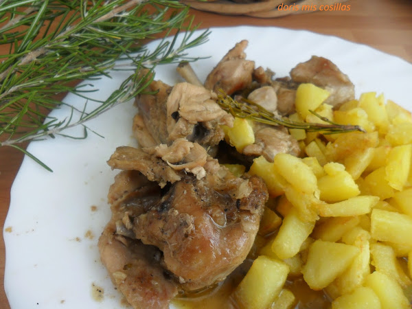 Añadir el romero,orégano y dientes de ajos sin pelar, verter el aceite de oliva, vino blanco seco por encima de la carne y dejar confitar a fuego lento.
