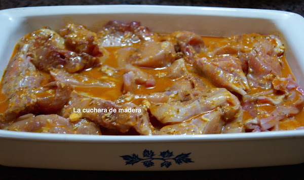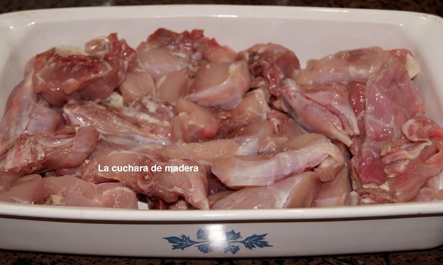 Colocamos el conejo troceado en una bandeja alargada, así cuando pongamos el adobo quedan todos los trozos de carne cubiertos.
