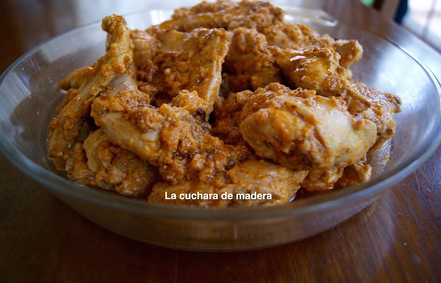 Pelamos los ajos, añadimos todos los ingredientes y trituramos .Nuestras madres lo hacían en el mortero, pero yo no lo he realizado así.Cubrimos toda la carne en el adobo.
