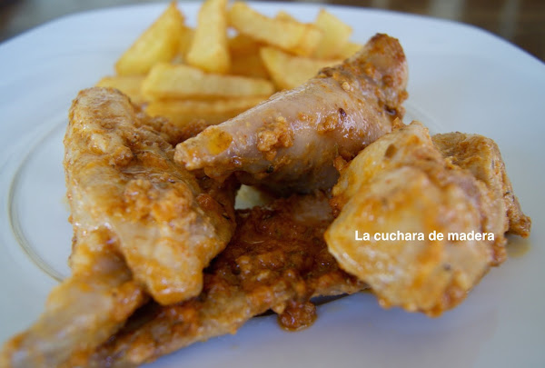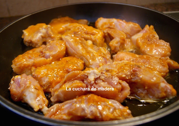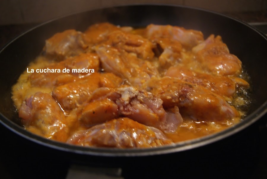 Cuando ya estén dorados le añadimos parte del adobo y lo dejamos unos minutos más.El conejo tiene que estar bien hecho.Lo puedes terminar de hacer en la sartén o bien enciendes el horno a 180/200 grados y lo dejas en una bandeja con el adobo unos 15 minutos.Yo lo terminé en el horno.