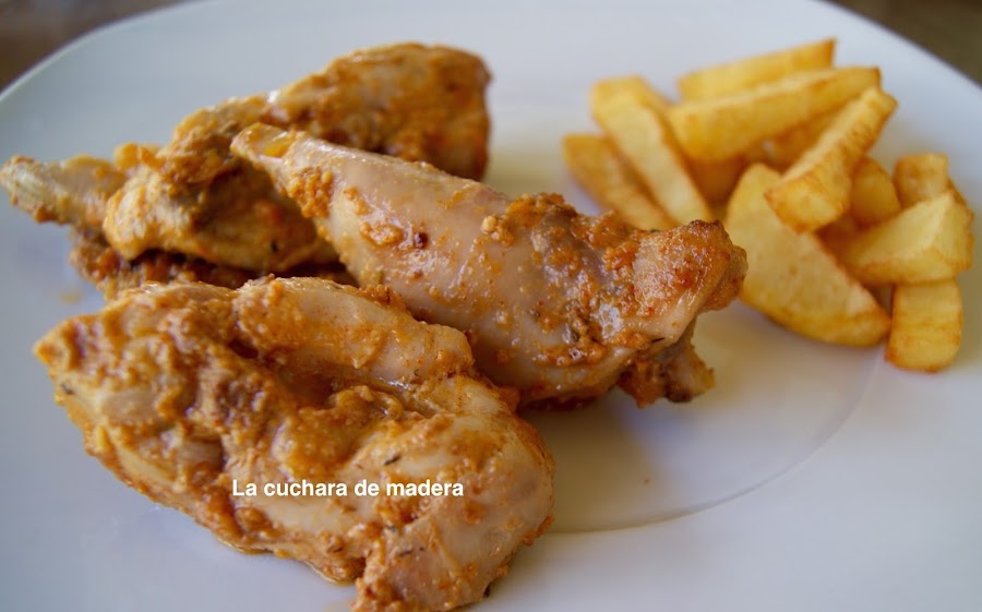 La otra opción, es emplatar directamente, colocando unas papas en un lado y diferentes piezas del conejo en otro.